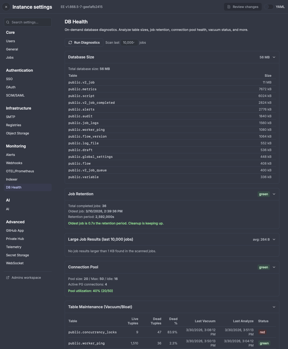 New on-demand database diagnostic dashboard for superadmins. Surfaces database size, job retention health, large job results, connection pool status, vacuum/bloat stats, slow queries, and datatable sizes — all from within Instance Settings.