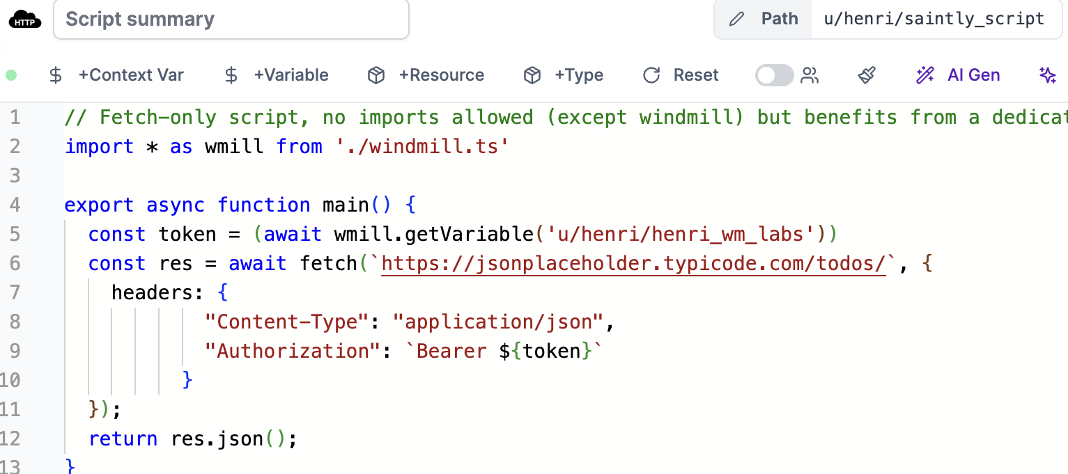 • Built-in helpers for accessing Windmill variables and resources.